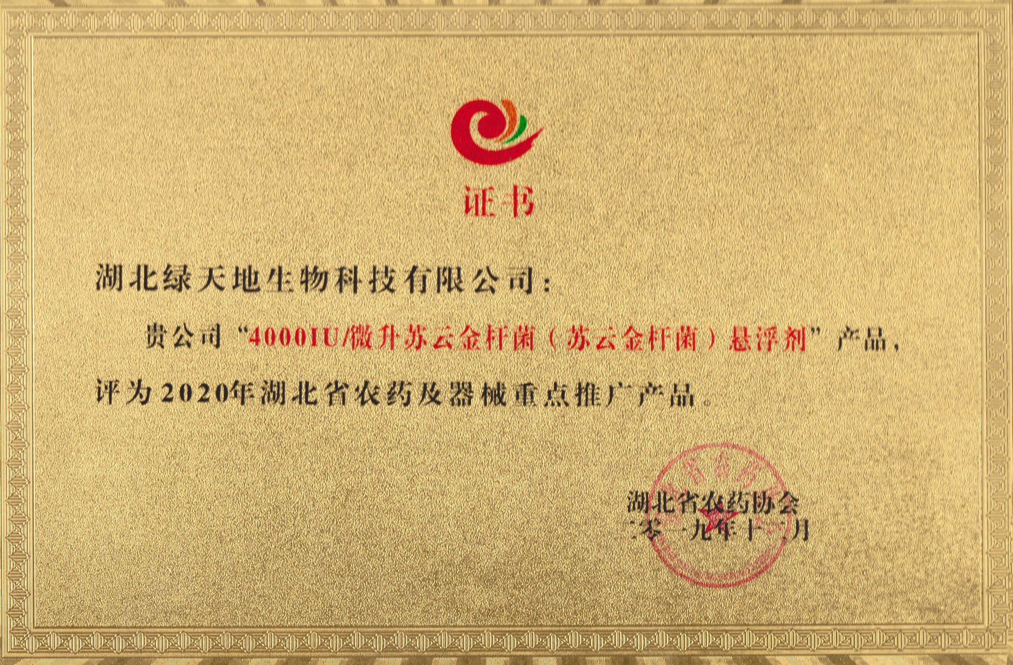 公司4000IU/微升蘇云金桿菌懸浮劑產品被評為2020年湖北農藥及器械重點推廣產品。